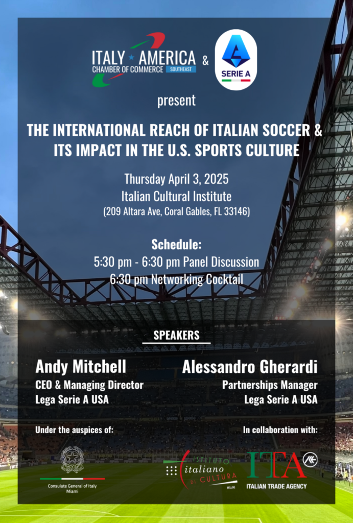 La IACCSE – Italy America Chamber of Commerce Southeast e la Lega Serie A propongono un workshop ad invito sulle strategie di marketing del campionato di calcio italiano in USA e sulle opportunità di partnership per le aziende.