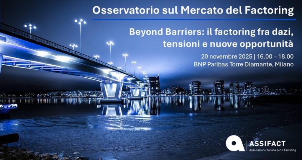 Domani, giovedì 20 novembre 2025, a Milano dalle ore 16 alle ore 18 (CET) presso BNP Paribas Torre Diamante, via Mike Bongiorno, avrà luogo l’incontro Beyond Barriers: il factoring tra dazi, tensioni e nuove opportunità organizzato da Assifact, nel quale verranno presentati i dati più recenti di questo mercato che vale circa il 13% del PIL italiano, e si ragionerà sui potenziali effetti dello scenario economico e geopolitico attuale e sulle opportunità che ne possono derivare.