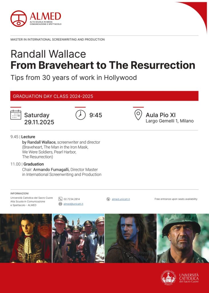 Domani, sabato 29 novembre 2025 alle ore 9:45 a Milano, nella sede dell’Università Cattolica del Sacro Cuore in Largo Gemelli 1, Aula Pio XI, si svolgerà la lecture From Braveheart to The Resurrection. Tips from 30 years of work in Hollywood di Randall Wallace, in occasione della consegna dei diplomi ai corsisti dell’anno accademico 2024/2025 del MISP – Master in International Screenwriting and Production. Ingresso libero fino ad esaurimento posti in aula.