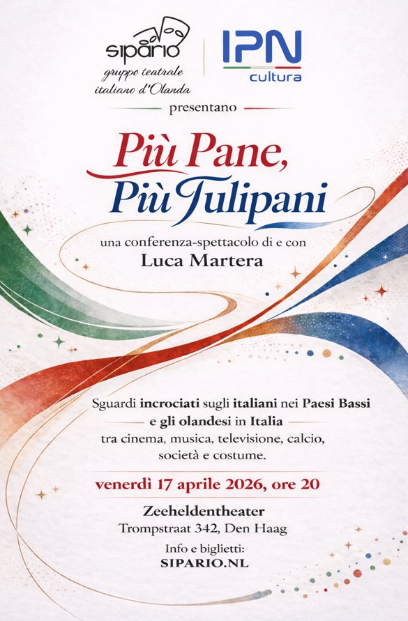 L’esordio avrà luogo domani venerdì 17 aprile 2026, nei Paesi Bassi, a L’Aia, con l’incontro Più Pane, Più Tulipani in collaborazione con il gruppo teatrale italiano d’Olanda Sipario e IPN Cultura, che esplorerà come il cinema e la televisione italiana hanno raccontato, immaginato e spesso reinventato i Paesi Bassi nel corso del Novecento e del XXI secolo, con un ulteriore approfondimento su come il cinema e la televisione olandese hanno rappresentato l’Italia. Ingresso: 16 euro. Per acquistare i biglietti: qui.